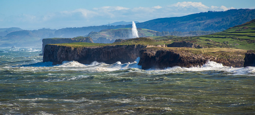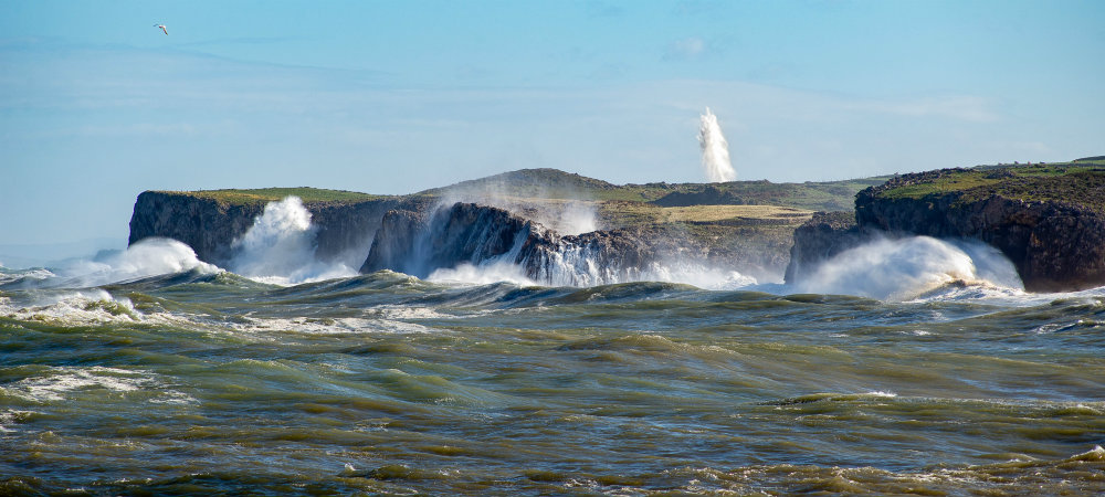 Con la mar en calma, los respiraderos se limitan a resoplar ( solo así ya impresionan), pero para verlos en plena acción, tenemos que tener el cantábrico muy enfadado y combinar la pleamar (Marea alta) con marejada.