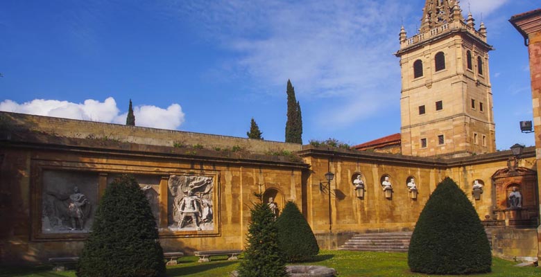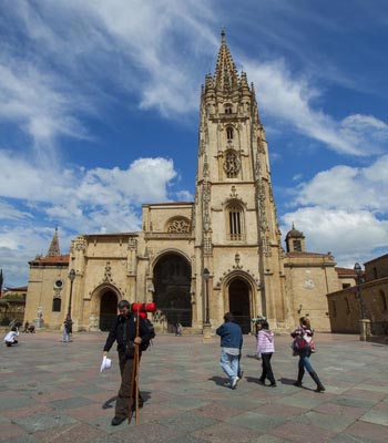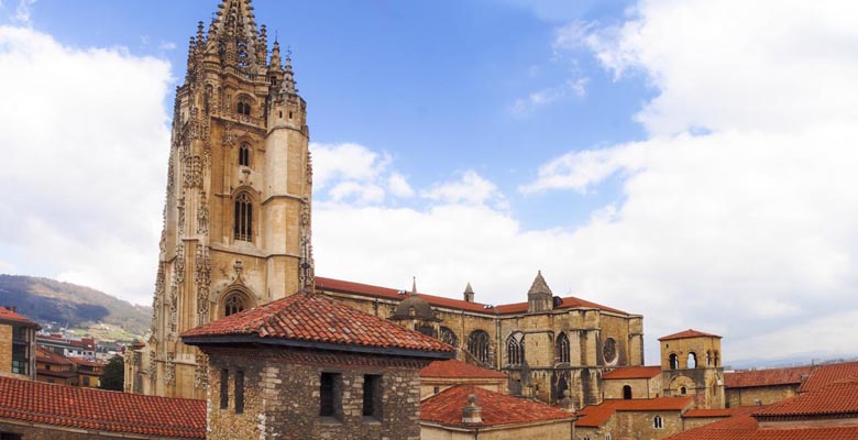 Mirando hacia el cielo como con vocación de alcanzarlo está la torre gótica de la Catedral, que preside majestuosa la plaza de Alfonso II el Casto, quizá la más famosa de la ciudad, y uno de los puntos de encuentro en el paseo por el casco histórico.