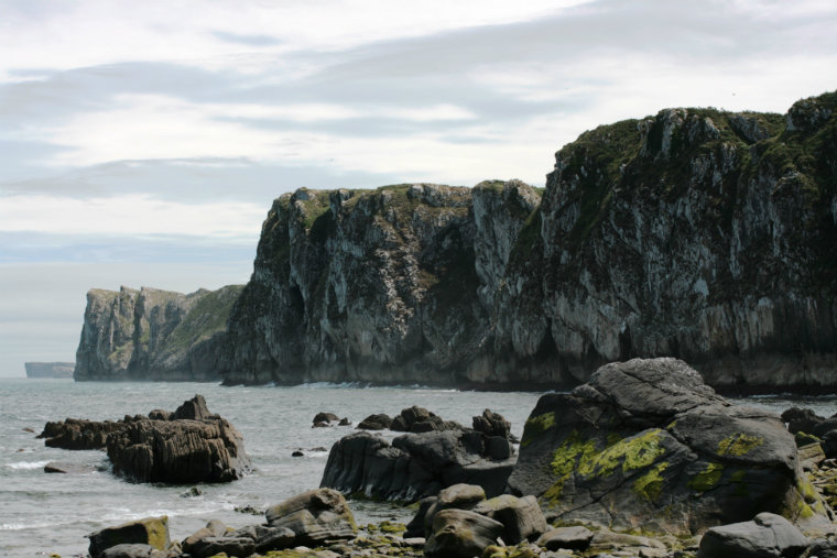 Pequeñas penínsulas verticales dan cobijo a los nidos de gaviotas y cormoranes a lo largo del camino. Un enorme tómbolo de roca se erige en un pequeño entrante del acantilado. Dos arcos de piedra gigantes aparecen, mientras caminamos, cual puentes hacia ninguna parte, uniendo fragmentos de acantilado y mayormente caminaremos por monte bajo, entre vacas y cabras,