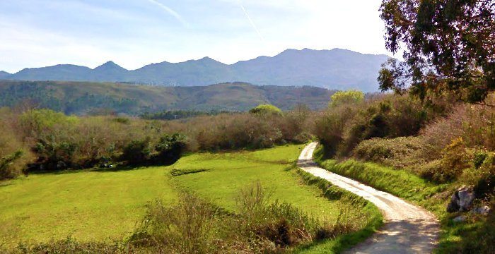 Tras tomar la carretera de acceso a la playa, la senda se desvía a la derecha siguiendo un trazado sinuoso con pequeños repechos, por un entorno de praderías.